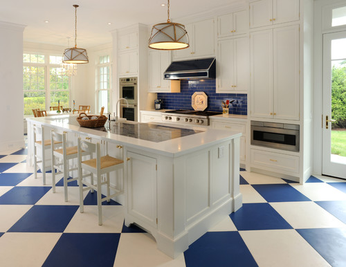 This kitchen is the perfect combination of flow, organization, and style. The blue backsplash contrasts with the tone, style, and pattern of the floor tiles, while stainless steel appliances bring modernity to space. The final and perfect touch are the big windows, which infuse the room with light.
