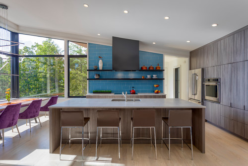 In this contemporary space, you will be able to have a great time cooking for your family. Lots of storage are granted through the addition of cabinetry and the presence of a multi-use kitchen island. The black granite countertop is perfect for working on recipes, and the wood of the countertop will reveal itself to be both practical and beautiful. Floor natural aged oak plank wood can match with wood countertop. The glass pendants from Restoration Hardware add modernity, while the 3×6 glossy finish blue kitchen backsplash tile brings just the right amount of color the space needs.