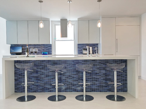 Deep blue mosaic backsplash tile in beautiful modern white kitchen