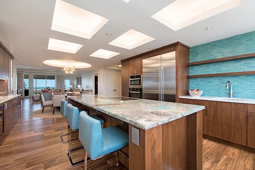 This all wood kitchen feels natural and comfortable even after a single glimpse. To accompany the element, beautiful light and shiny blue backsplash tiles are technically positioned and paired to similarly colored chairs, together with a undermount sink, flat-panel cabinets, and stainless-steel appliances. If you are still not impressed, give a second look at the beautiful marble covering the island: changed your mind?