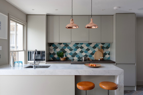 This industrial and modern kitchen is composed of a beautiful pattern, starting from the dark wooden floor, continuing with the white marble island, up to dark blue, light blue and white backsplash. The cabinetry is minimalist and comes in a gorgeous gray shade, whilst the stools and pendants come in an industrial style and copper color.