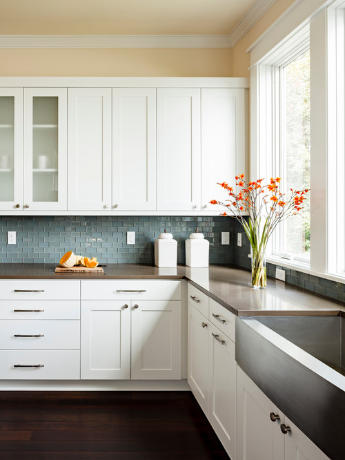 For a mid-sized galley kitchen, this perfectly fit style. The gray floor matches the stainless-steel appliances and the metallic stools; the white cabinetry and light blue subway tiles backsplash give a fun and light touch to the whole room. Don't miss out on the farmhouse sink and flat-panel cabinets.