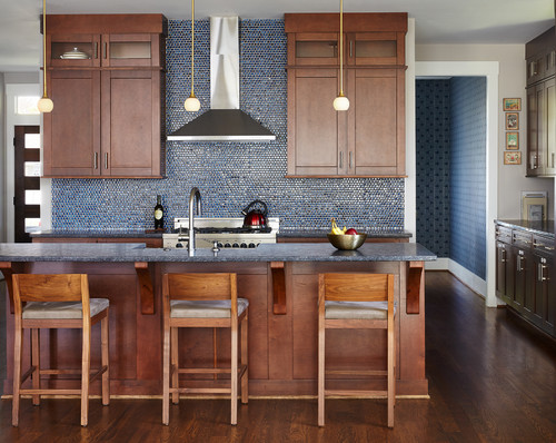 Brown wood kitchen with penny circle blue kitchen backsplash tile